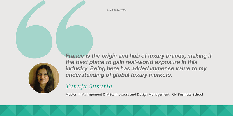Tanuja Susarla’s passion for luxury and design led her to pursue a Master in Management (MIM) and MSc. in Luxury and Design Management at ICN Business School. France, as the global hub for luxury brands, was the perfect destination for her to gain an in-depth understanding of this niche field. From iconic fashion houses to world-renowned design agencies, the country’s rich heritage in luxury made it the ideal place to study and work.