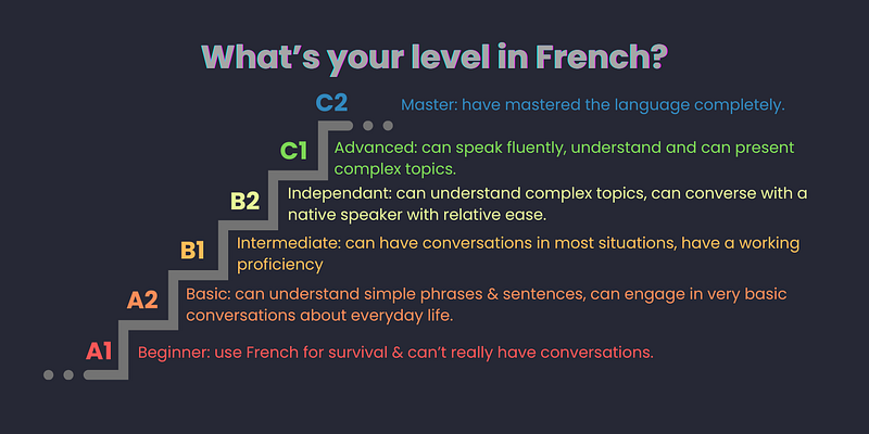 The CEFR framework lays out French proficiency in six levels: A1 (beginner), A2 (elementary), B1 (intermediate), B2 (upper intermediate), C1 (advanced), and C2 (mastery). While most people think that an A2 level on the Common European Framework of Reference for Languages (CEFR) is enough to work with a French company, it is not sufficient for working proficiency.